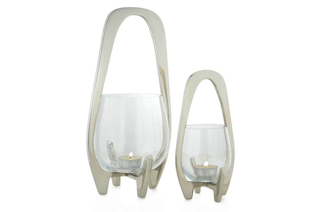 The geometric cradle frames are made from cast aluminium finished with nickel, and the holders made from cupped glass, making for a futuristic feature tealight.