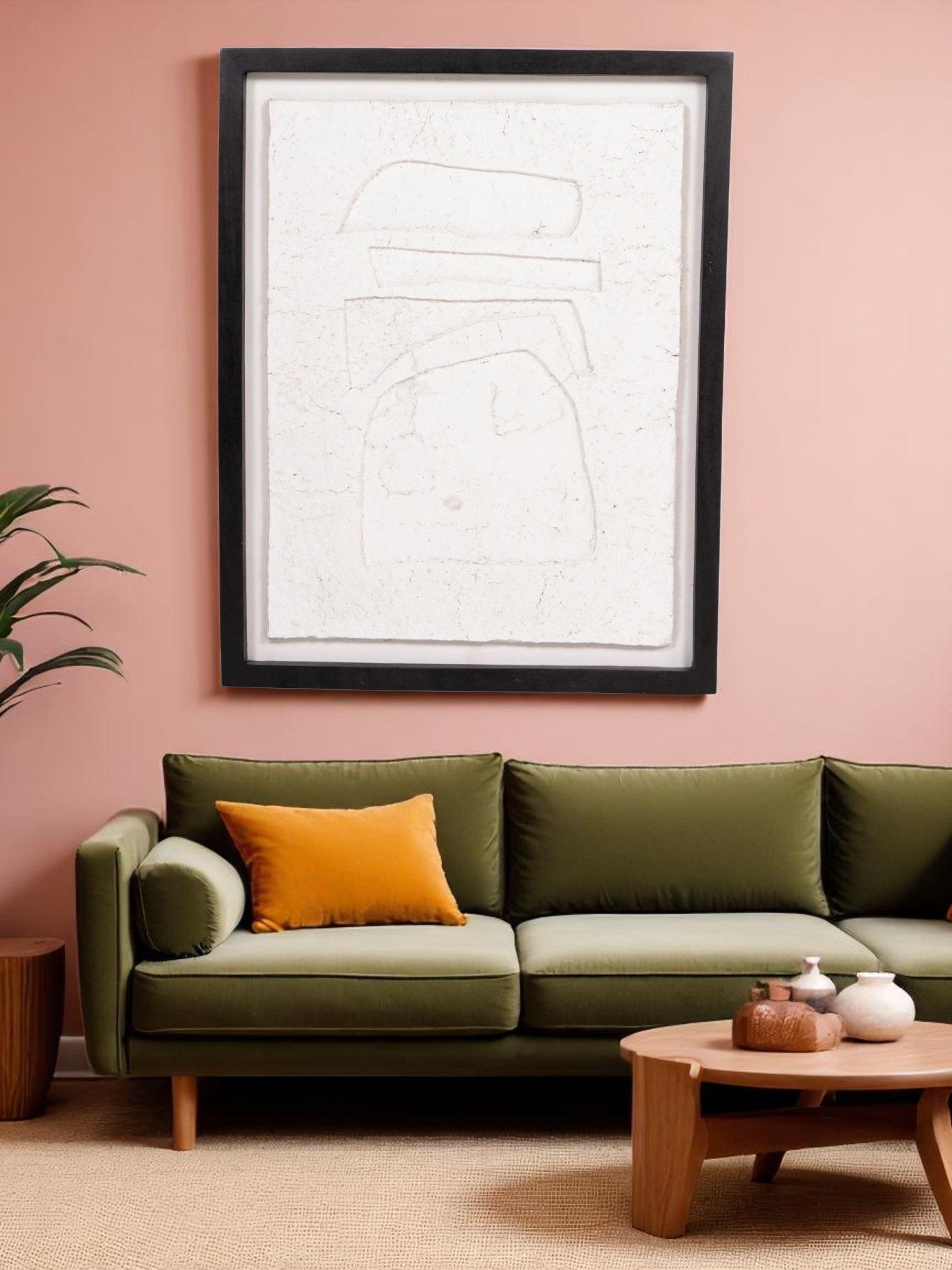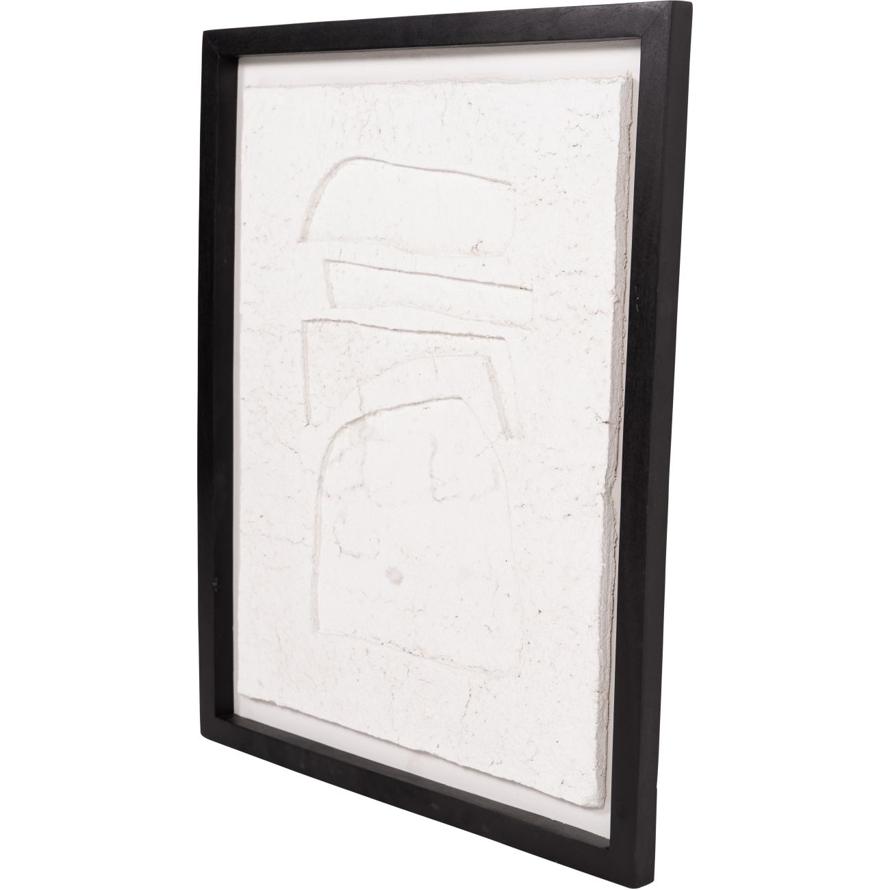 Abstract Embossed Paper Mache Wall Decor, a tactile masterpiece in off white framed in solid distressed espresso coloured wood and backed with linen for added sophistication.